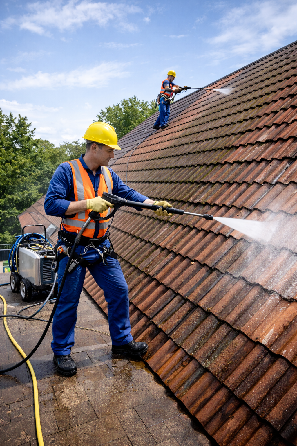 Dachreinigung entfernt Moos, Algen und Schmutz vom Dach, schützt die Dachziegel und sorgt für eine lange Lebensdauer des Daches.